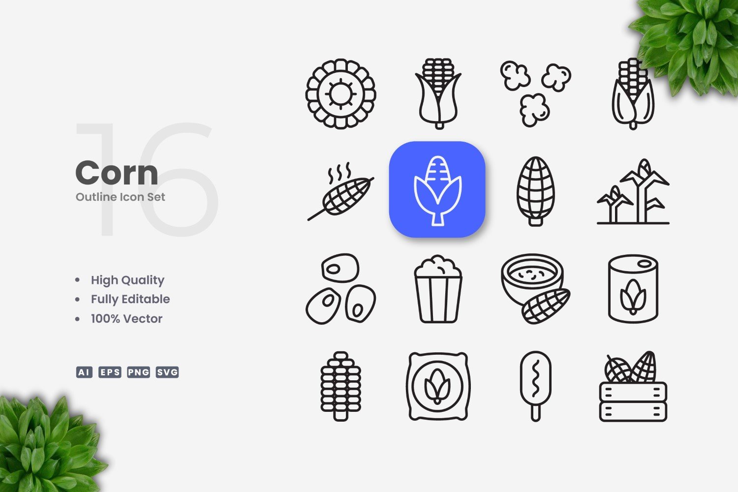 Set of 16 Corn outline icons | Simple and clean design, perfect for websites, mobile apps, books, social media, infographics, flyer, print, banners, posters and many more. To resize, change color, or edit stroke weight, you can easily edit on vector software like Adobe Illustrator and CorelDRAW.