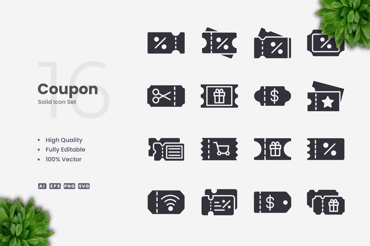 Set of 16 Coupon Solid Icons | Simple and clean design, perfect for websites, mobile apps, books, social media, infographics, flyer, print, banners, posters and many more. To resize or change color you can easily edit on vector software like Adobe Illustrator and CorelDRAW.