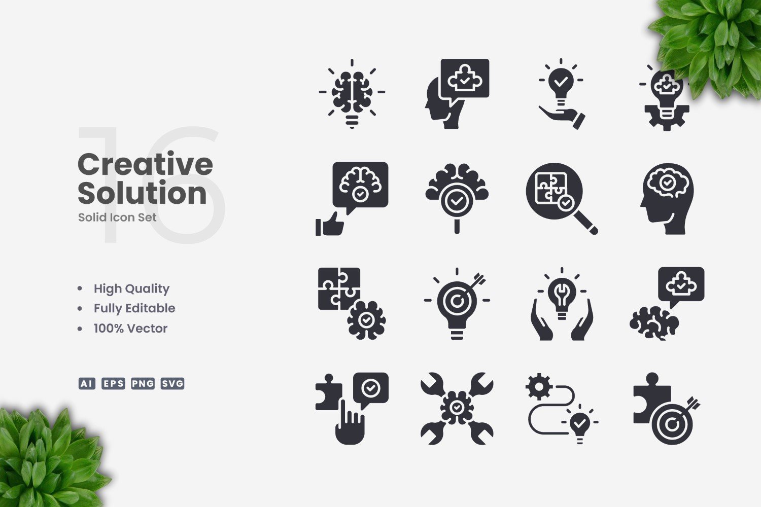 Set of 16 Creative Solution Solid Icons | Simple and clean design, perfect for websites, mobile apps, books, social media, infographics, flyer, print, banners, posters and many more. To resize or change color you can easily edit on vector software like Adobe Illustrator and CorelDRAW.