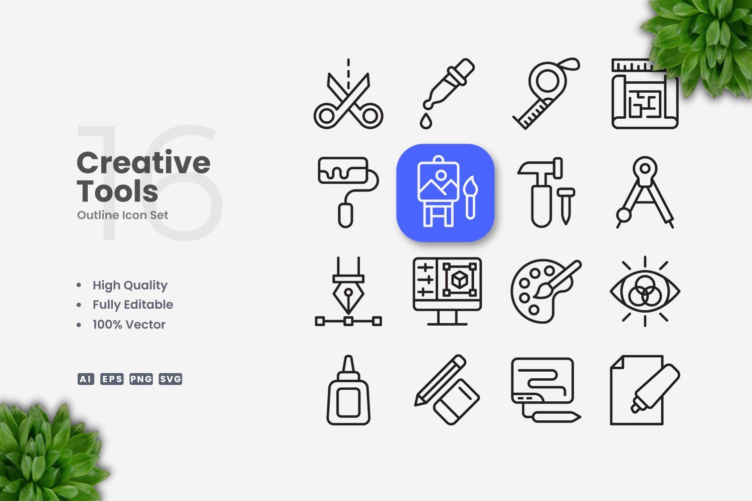 Set of 16 Creative Tools outline icons | Simple and clean design, perfect for websites, mobile apps, books, social media, infographics, flyer, print, banners, posters and many more. To resize, change color, or edit stroke weight, you can easily edit on vector software like Adobe Illustrator and CorelDRAW.