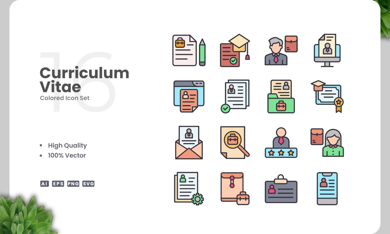 Set of 16 Curriculum Vitae color icons | Simple and clean design, perfect for websites, mobile apps, books, social media, infographics, flyer, print, banners, posters and many more. To resize or change color you can easily edit on vector software like Adobe Illustrator and CorelDRAW.