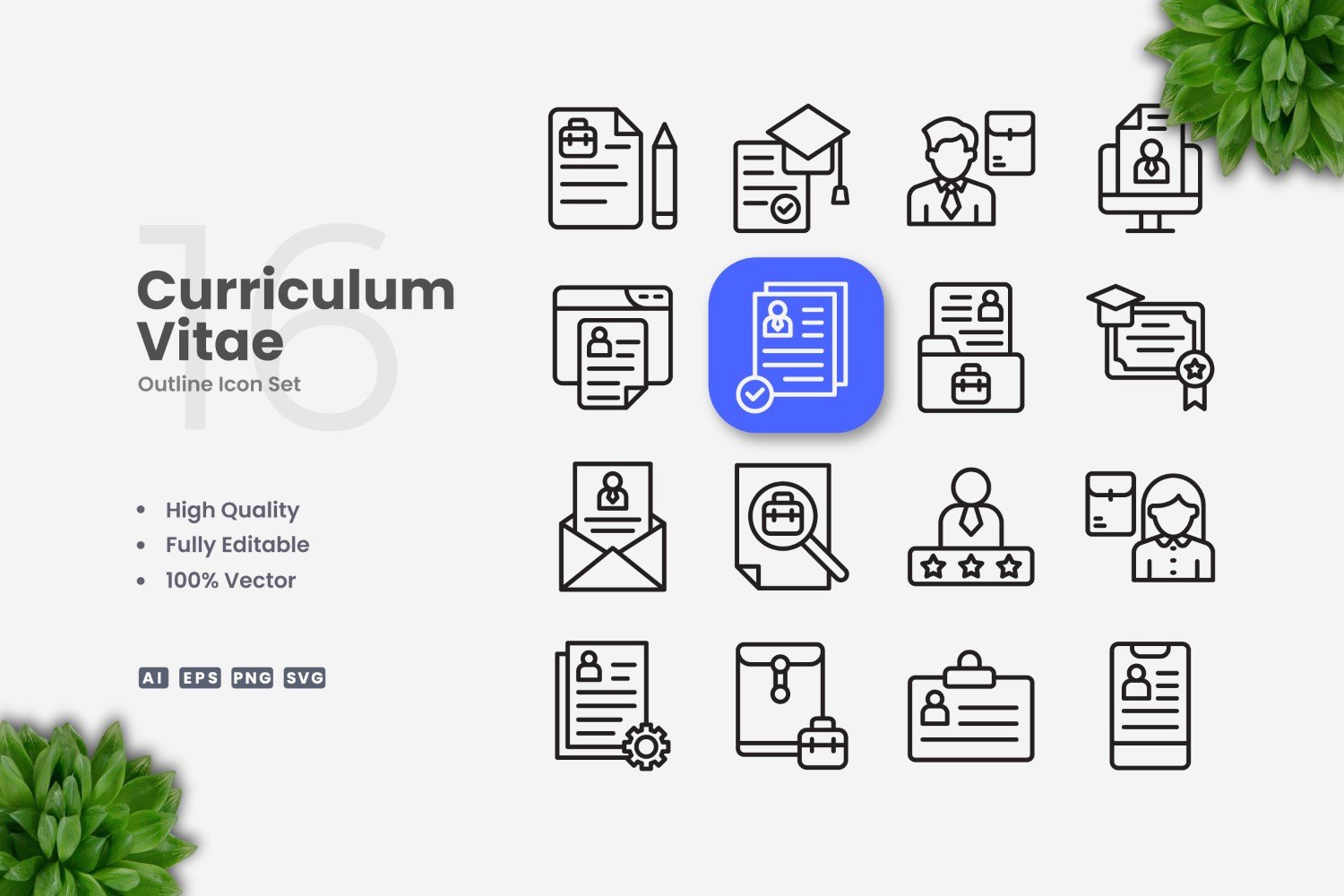 Set of 16 Curriculum Vitae outline icons | Simple and clean design, perfect for websites, mobile apps, books, social media, infographics, flyer, print, banners, posters and many more. To resize, change color, or edit stroke weight, you can easily edit on vector software like Adobe Illustrator and CorelDRAW.