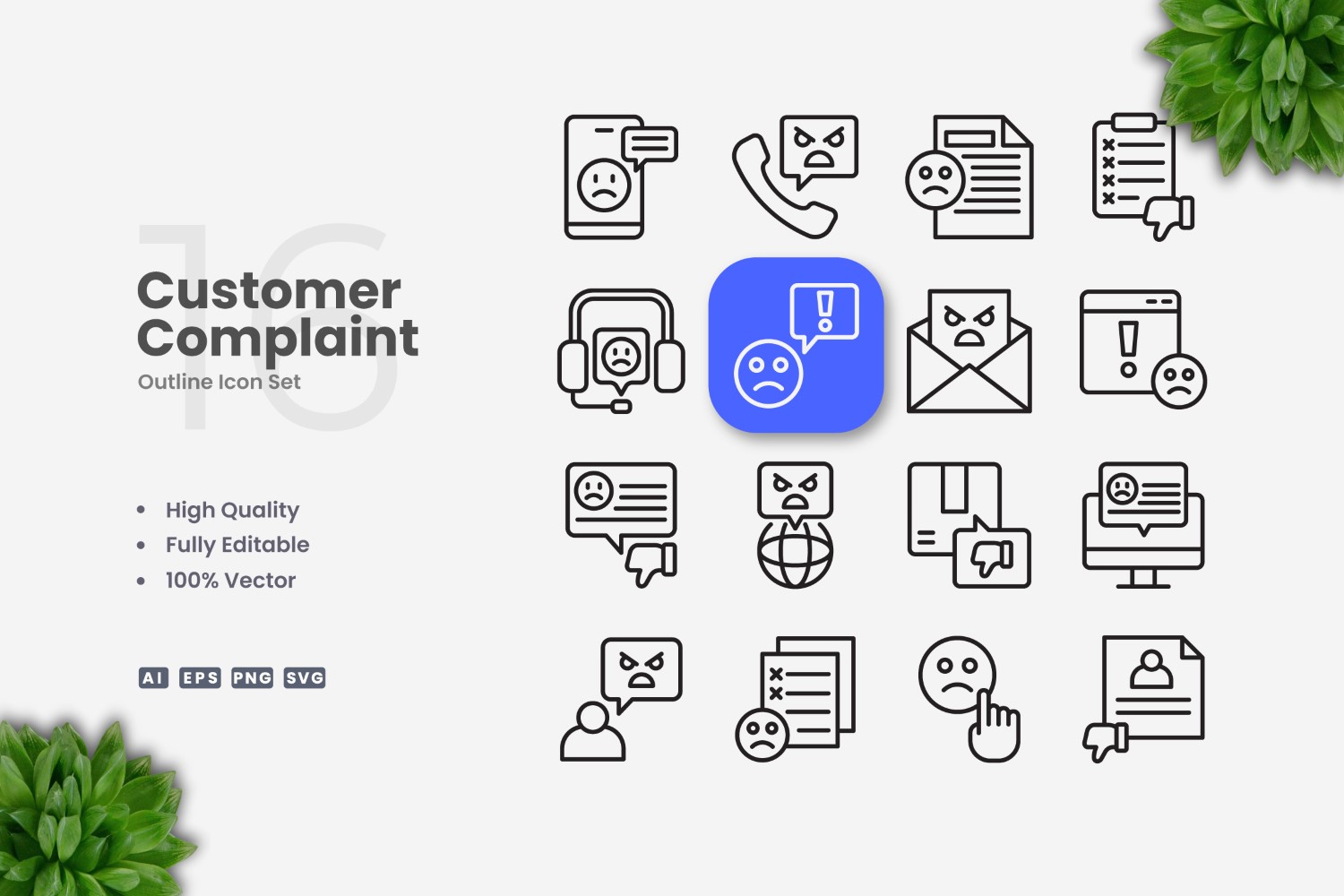 Set of 16 Customer Complaint Outline Icons | Simple and clean design, perfect for websites, mobile apps, books, social media, infographics, flyer, print, banners, posters and many more. To resize or change color you can easily edit on vector software like Adobe Illustrator and CorelDRAW.