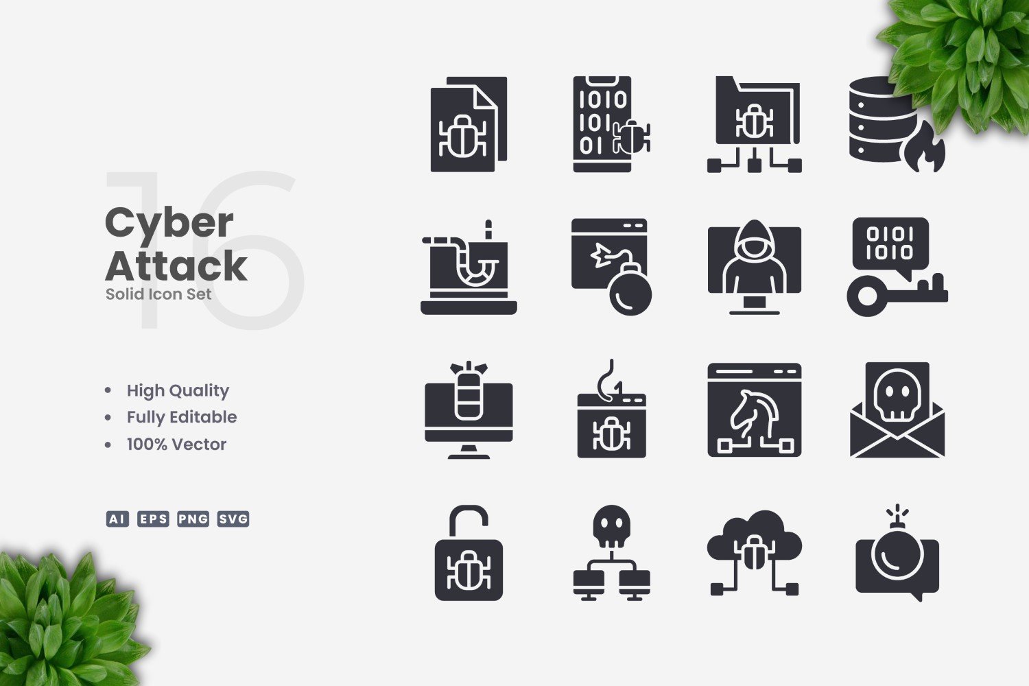 Set of 16 Cyber Attack Solid Icons | Simple and clean design, perfect for websites, mobile apps, books, social media, infographics, flyer, print, banners, posters and many more. To resize or change color you can easily edit on vector software like Adobe Illustrator and CorelDRAW.