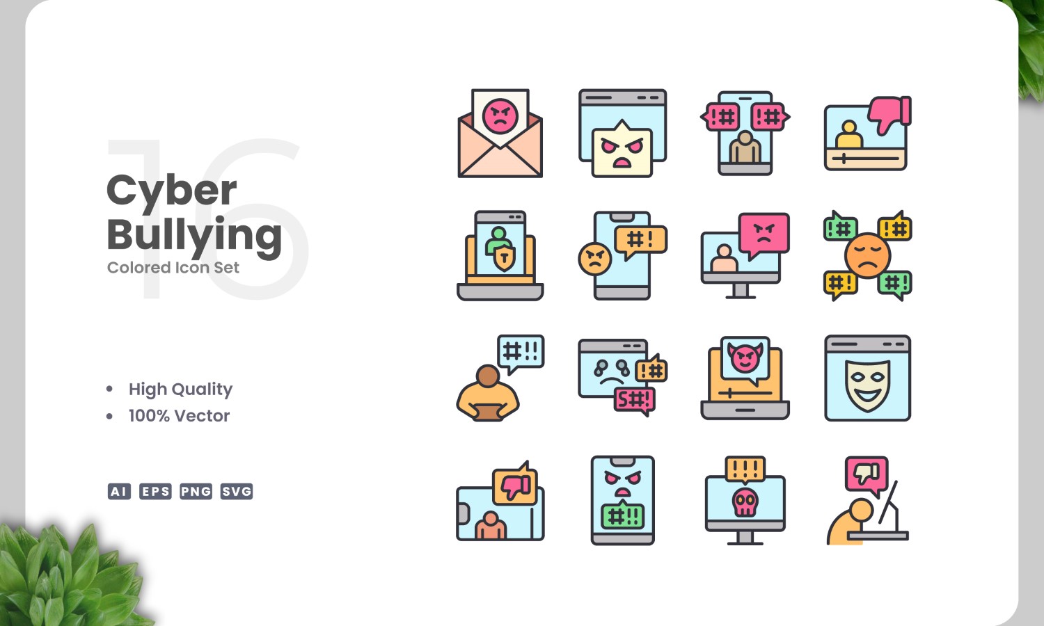 Set of 16 Cyber Bullying color icons | Simple and clean design, perfect for websites, mobile apps, books, social media, infographics, flyer, print, banners, posters and many more. To resize or change color you can easily edit on vector software like Adobe Illustrator and CorelDRAW.