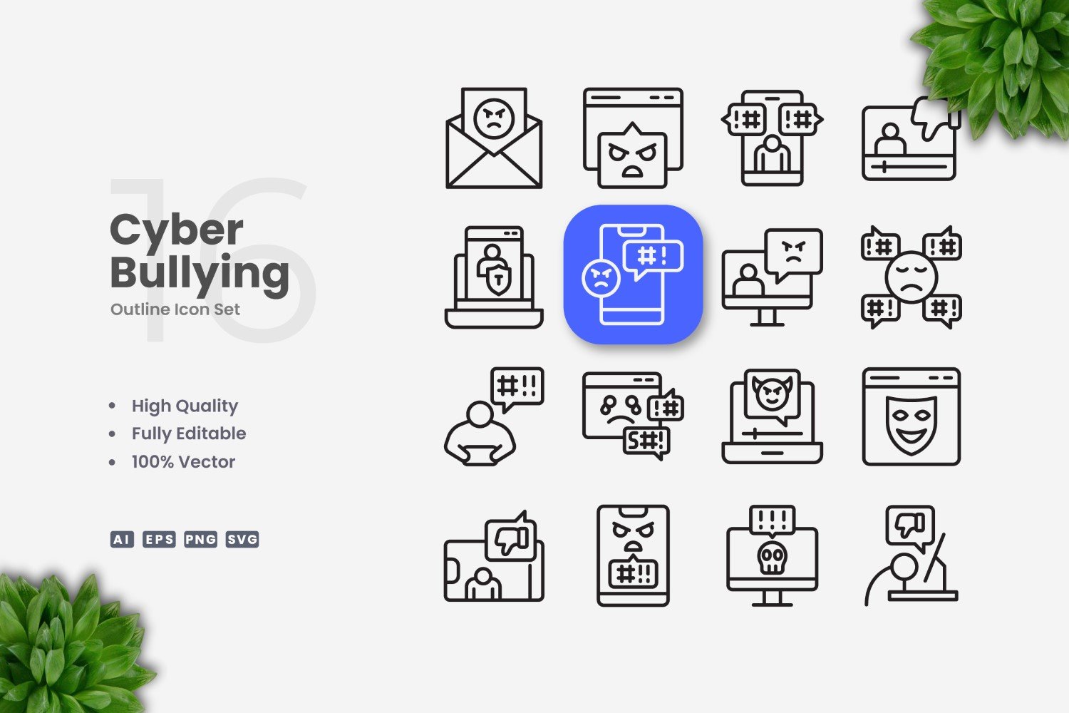 Set of 16 Cyber Bullying outline icons | Simple and clean design, perfect for websites, mobile apps, books, social media, infographics, flyer, print, banners, posters and many more. To resize, change color, or edit stroke weight, you can easily edit on vector software like Adobe Illustrator and CorelDRAW.