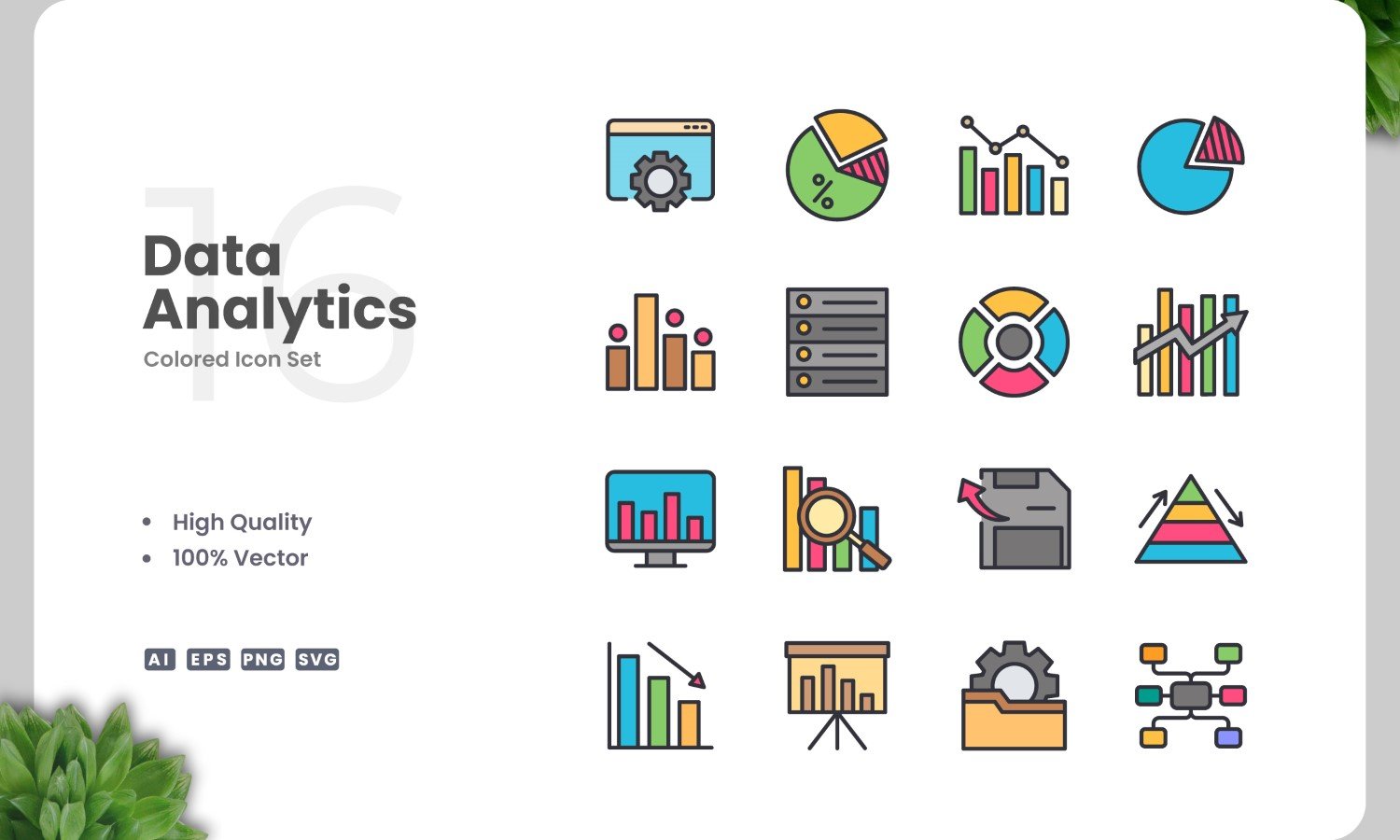Set of 16 Data Analytics color icons | Simple and clean design, perfect for websites, mobile apps, books, social media, infographics, flyer, print, banners, posters and many more. To resize or change color you can easily edit on vector software like Adobe Illustrator and CorelDRAW.