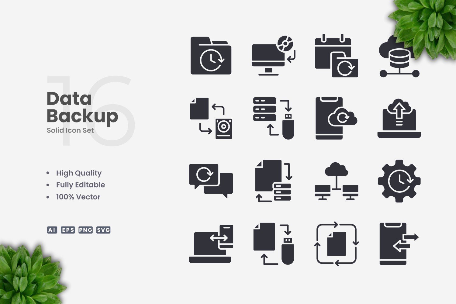 Set of 16 Data Backup Solid Icons | Simple and clean design, perfect for websites, mobile apps, books, social media, infographics, flyer, print, banners, posters and many more. To resize or change color you can easily edit on vector software like Adobe Illustrator and CorelDRAW.