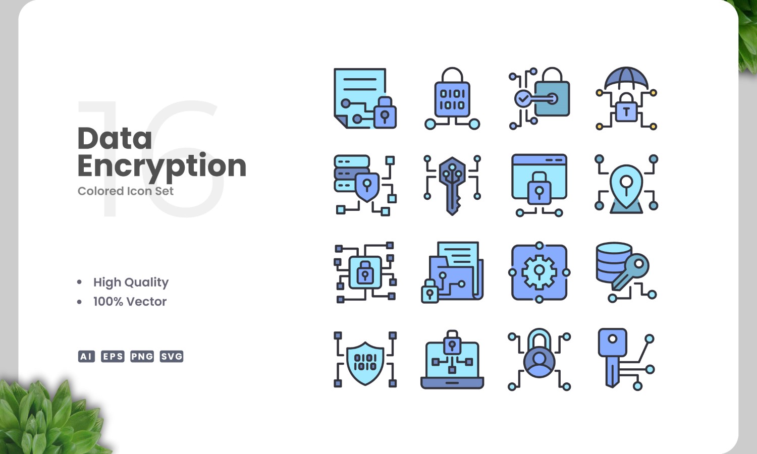 Set of 16 Data Encryption color icons | Simple and clean design, perfect for websites, mobile apps, books, social media, infographics, flyer, print, banners, posters and many more. To resize or change color you can easily edit on vector software like Adobe Illustrator and CorelDRAW.