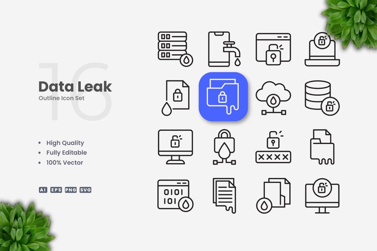 Set of 16 Data Leak outline icons | Simple and clean design, perfect for websites, mobile apps, books, social media, infographics, flyer, print, banners, posters and many more. To resize, change color, or edit stroke weight, you can easily edit on vector software like Adobe Illustrator and CorelDRAW.