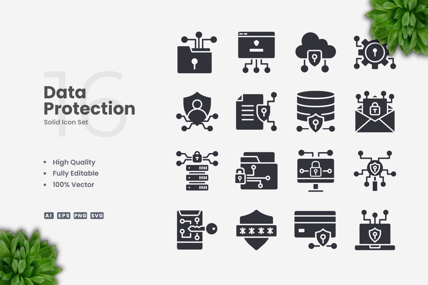 Set of 16 Data Protection Solid Icons | Simple and clean design, perfect for websites, mobile apps, books, social media, infographics, flyer, print, banners, posters and many more. To resize or change color you can easily edit on vector software like Adobe Illustrator and CorelDRAW.