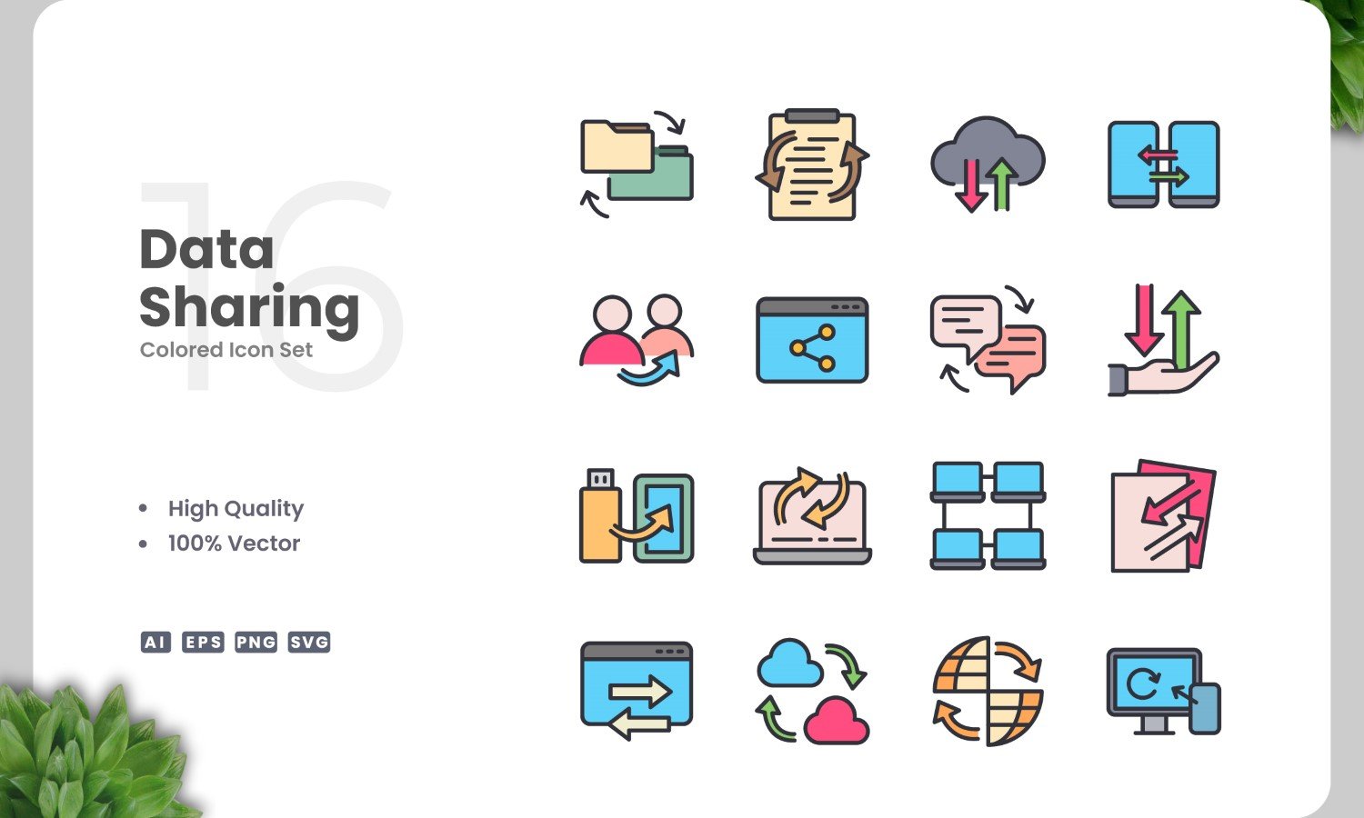 Set of 16 Data Sharing color icons | Simple and clean design, perfect for websites, mobile apps, books, social media, infographics, flyer, print, banners, posters and many more. To resize or change color you can easily edit on vector software like Adobe Illustrator and CorelDRAW.