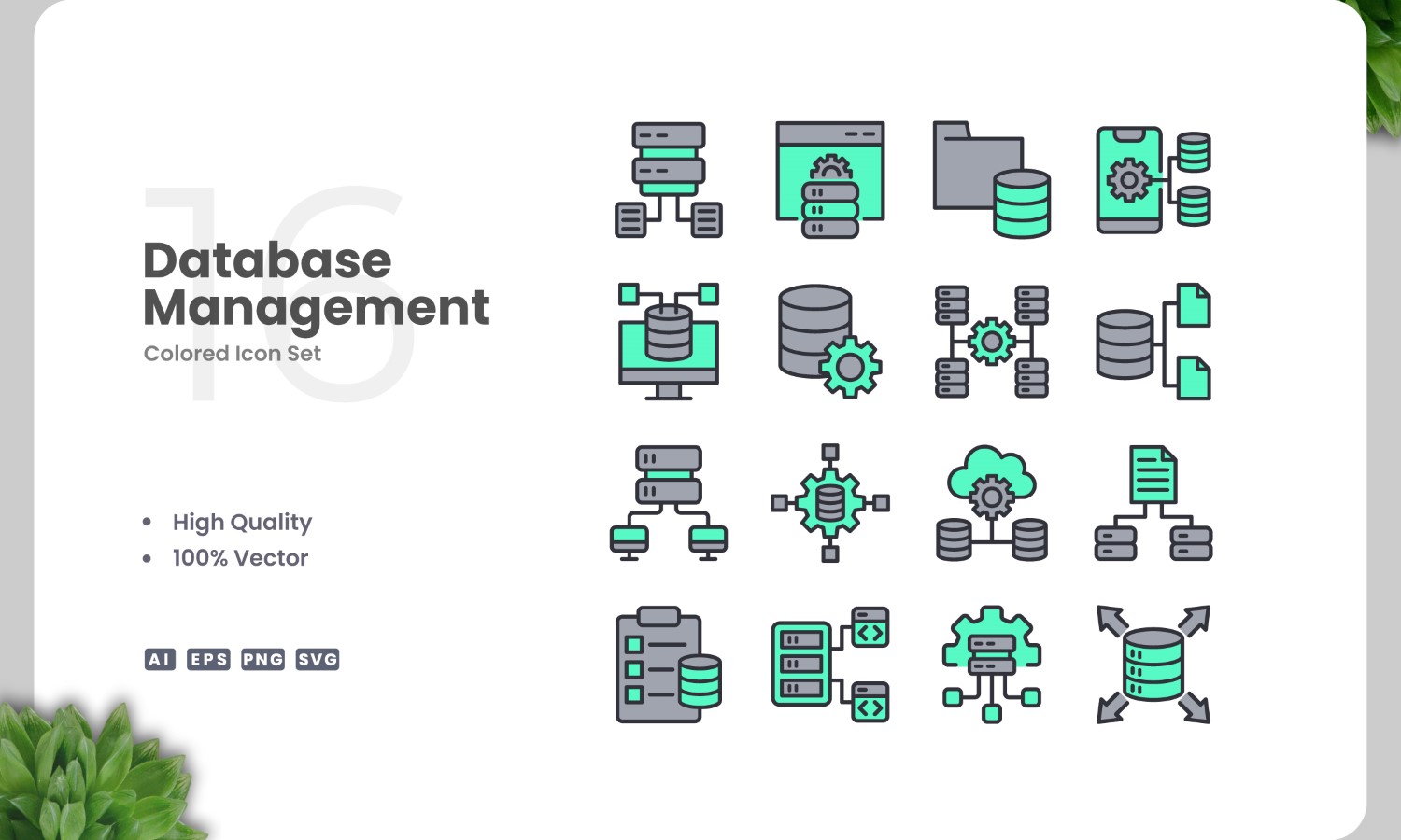 Set of 16 Database Management color icons | Simple and clean design, perfect for websites, mobile apps, books, social media, infographics, flyer, print, banners, posters and many more. To resize or change color you can easily edit on vector software like Adobe Illustrator and CorelDRAW.