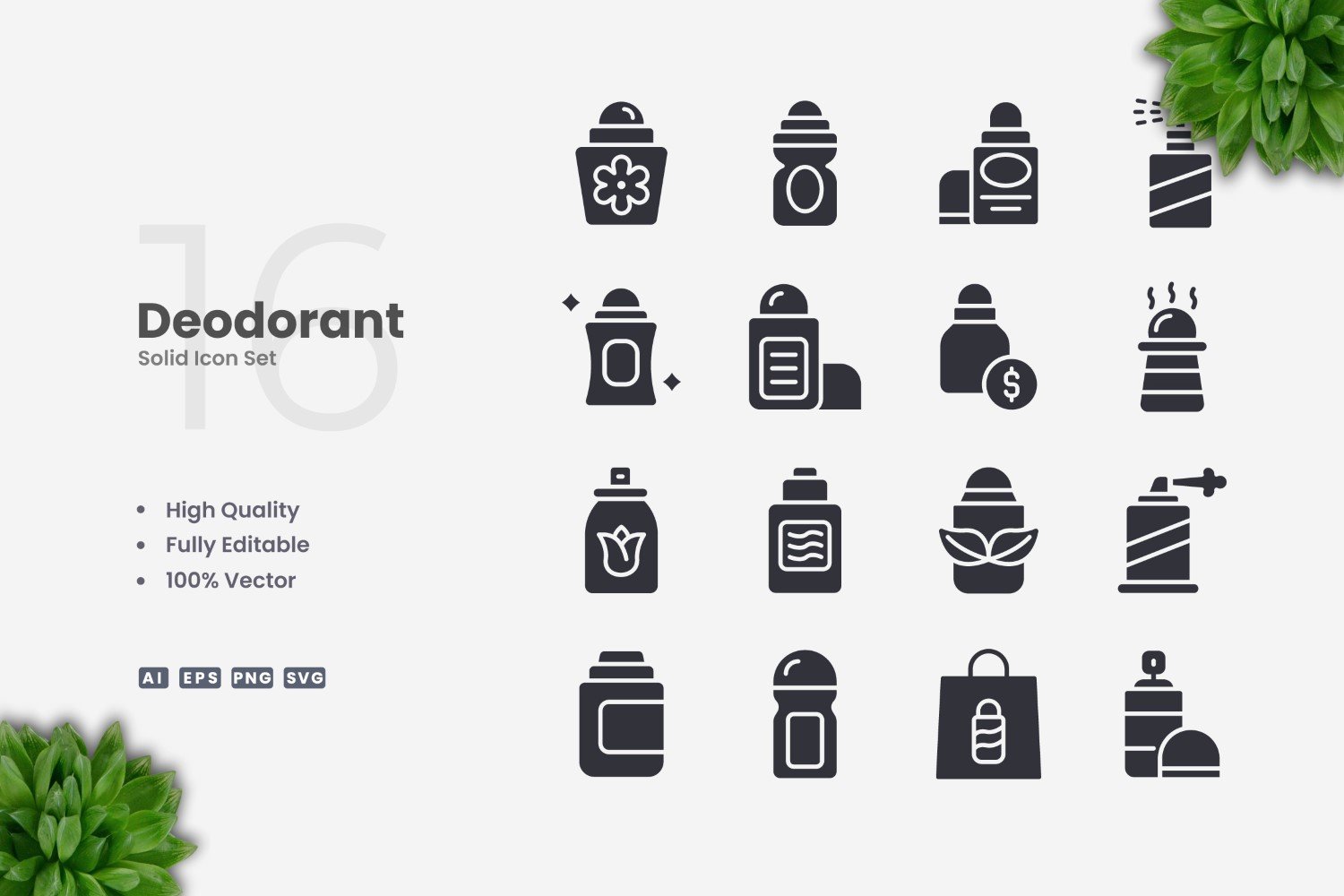 Set of 16 Deodorant Solid Icons | Simple and clean design, perfect for websites, mobile apps, books, social media, infographics, flyer, print, banners, posters and many more. To resize or change color you can easily edit on vector software like Adobe Illustrator and CorelDRAW.