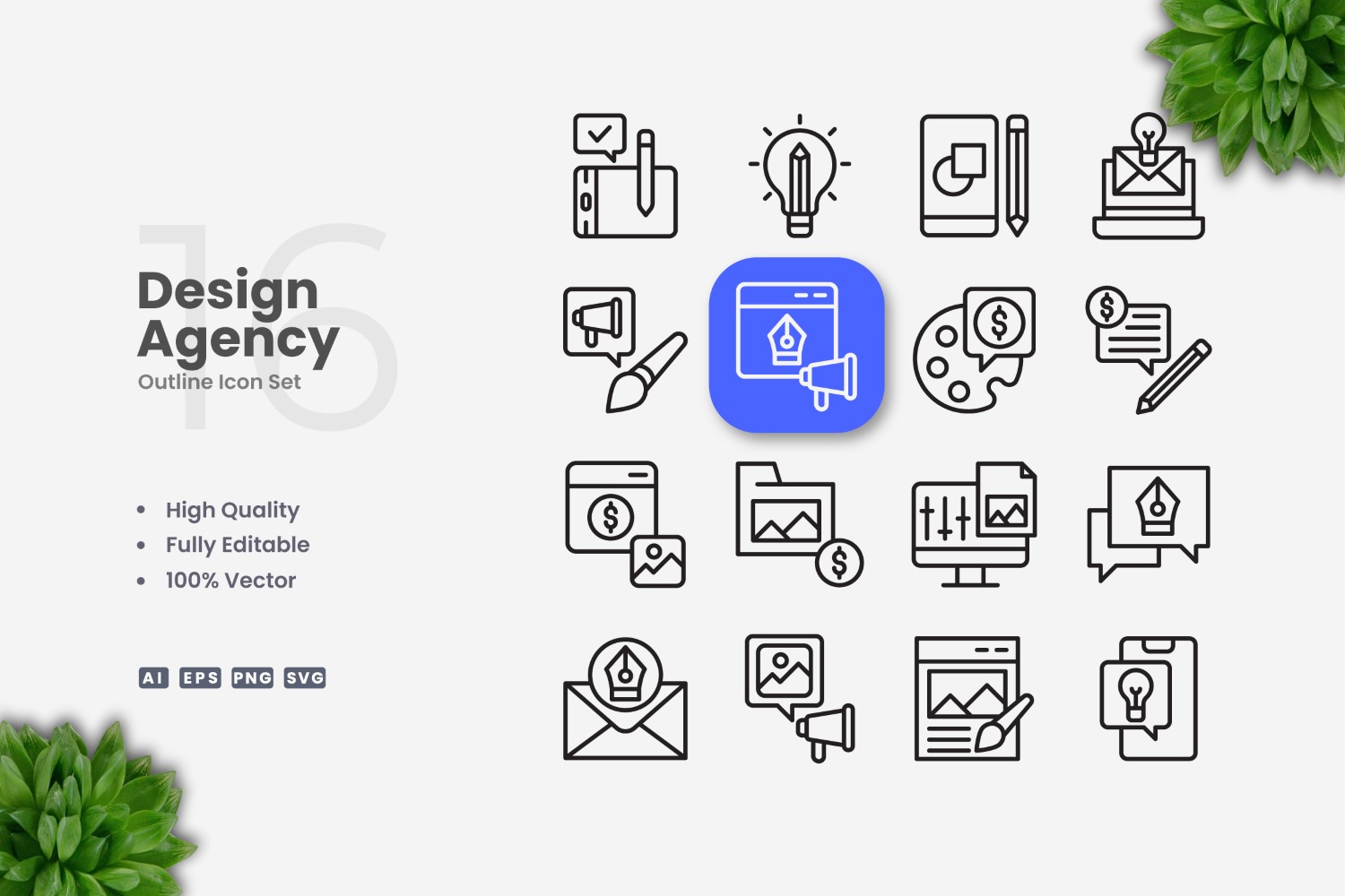 Set of 16 Design Agency Outline Icons | Simple and clean design, perfect for websites, mobile apps, books, social media, infographics, flyer, print, banners, posters and many more. To resize or change color you can easily edit on vector software like Adobe Illustrator and CorelDRAW.