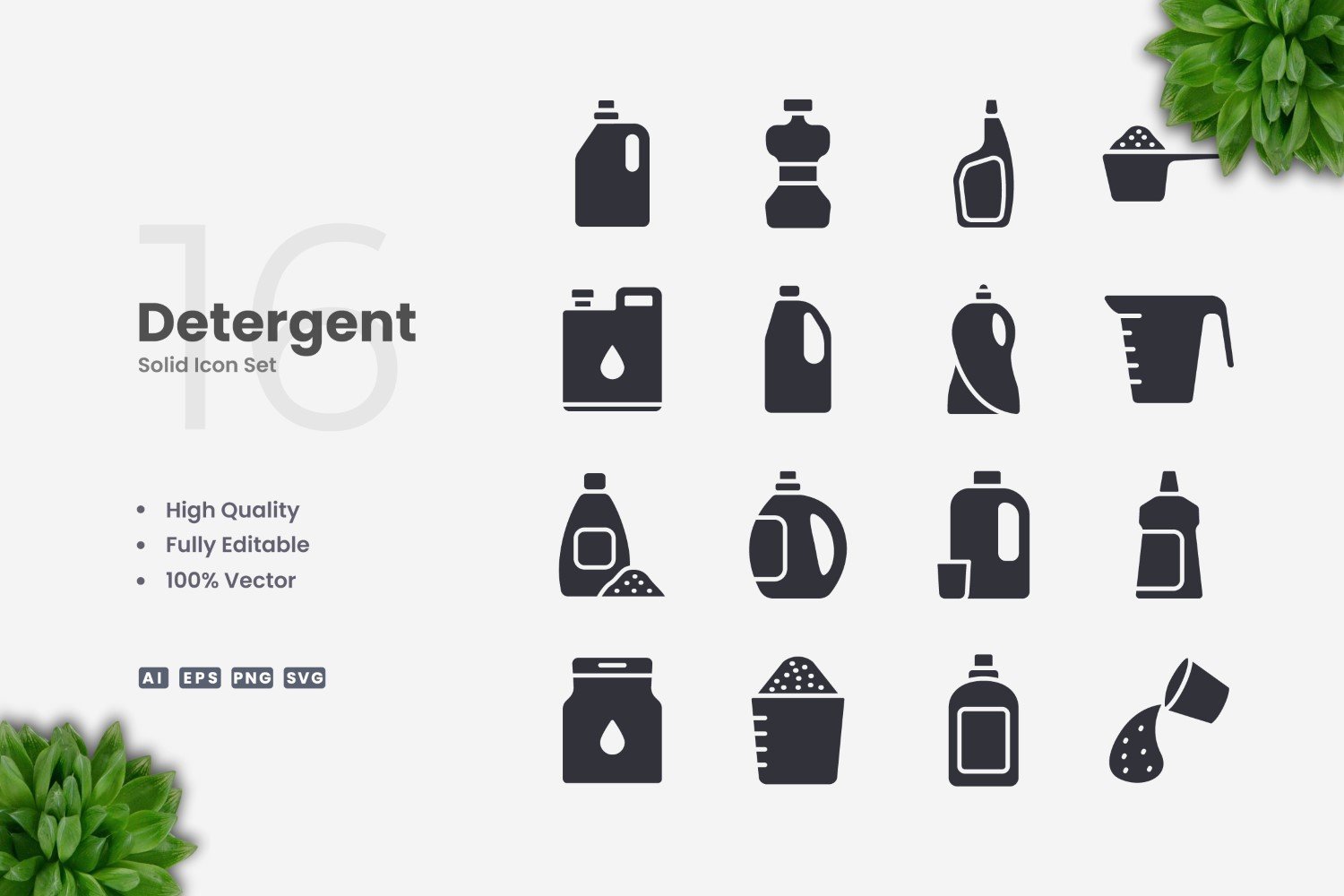 Set of 16 Detergent Solid Icons | Simple and clean design, perfect for websites, mobile apps, books, social media, infographics, flyer, print, banners, posters and many more. To resize or change color you can easily edit on vector software like Adobe Illustrator and CorelDRAW.