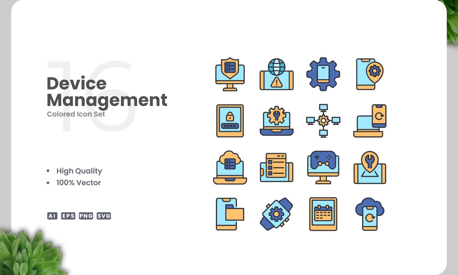 Set of 16 Device Management color icons | Simple and clean design, perfect for websites, mobile apps, books, social media, infographics, flyer, print, banners, posters and many more. To resize or change color you can easily edit on vector software like Adobe Illustrator and CorelDRAW.