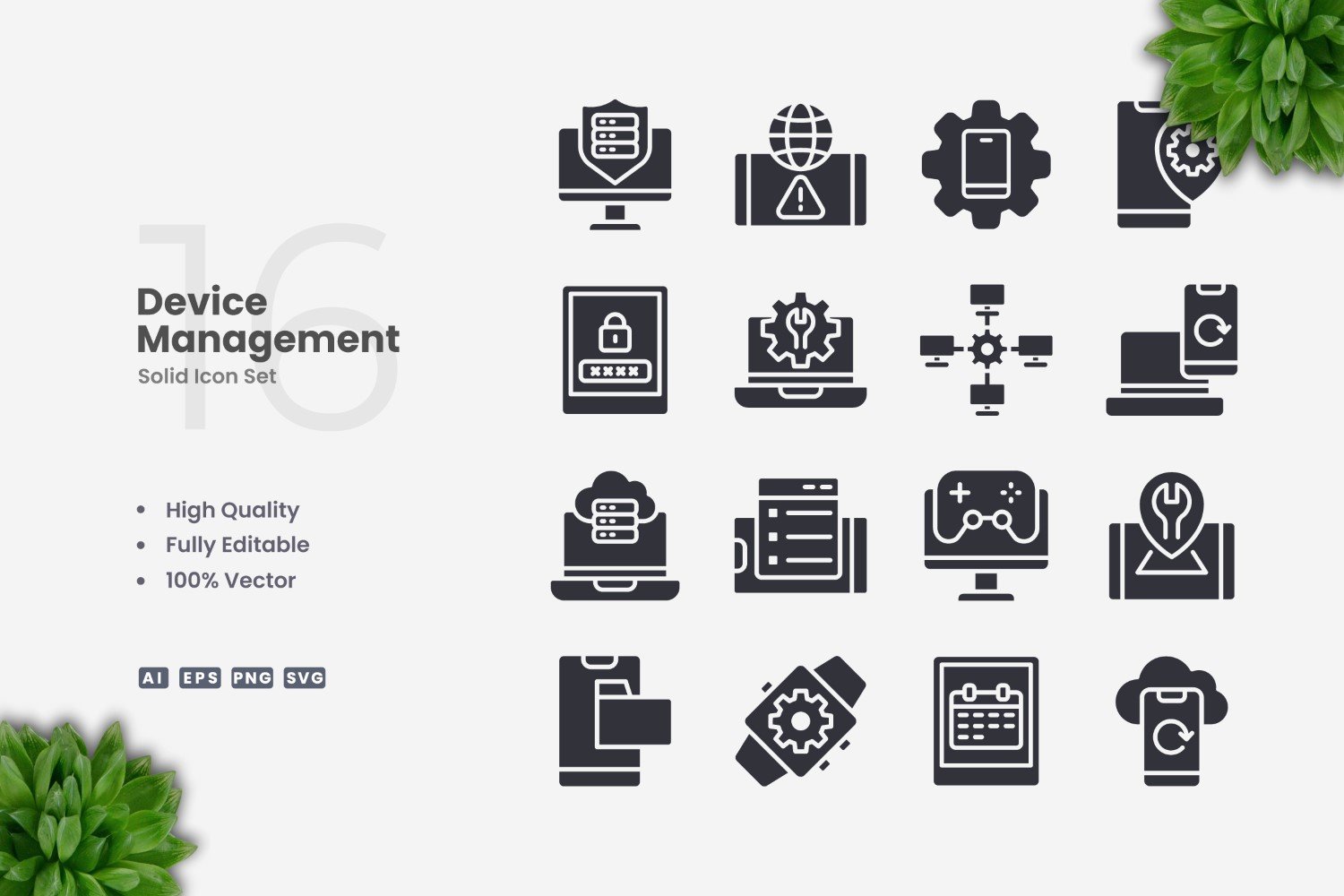 Set of 16 Device Management Solid Icons | Simple and clean design, perfect for websites, mobile apps, books, social media, infographics, flyer, print, banners, posters and many more. To resize or change color you can easily edit on vector software like Adobe Illustrator and CorelDRAW.
