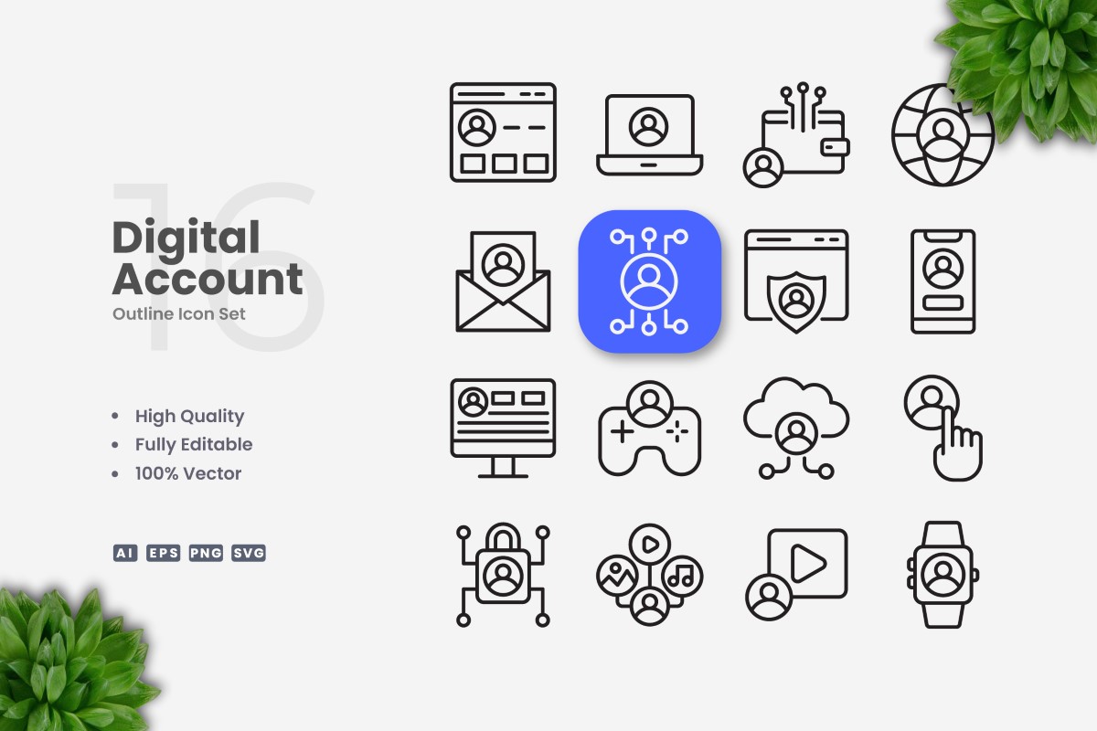 Set of 16 Digital Account outline icons | Simple and clean design, perfect for websites, mobile apps, books, social media, infographics, flyer, print, banners, posters and many more. To resize, change color, or edit stroke weight, you can easily edit on vector software like Adobe Illustrator and CorelDRAW.