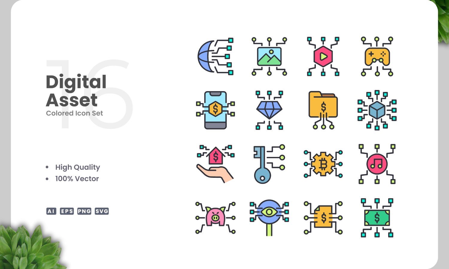 Set of 16 Digital Asset color icons | Simple and clean design, perfect for websites, mobile apps, books, social media, infographics, flyer, print, banners, posters and many more. To resize or change color you can easily edit on vector software like Adobe Illustrator and CorelDRAW.
