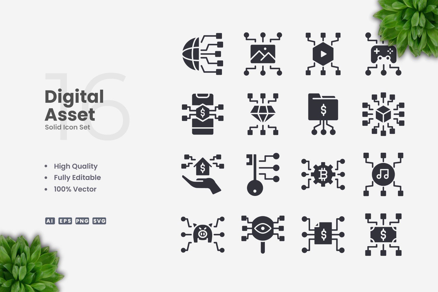 Set of 16 Digital Asset Solid Icons | Simple and clean design, perfect for websites, mobile apps, books, social media, infographics, flyer, print, banners, posters and many more. To resize or change color you can easily edit on vector software like Adobe Illustrator and CorelDRAW.
