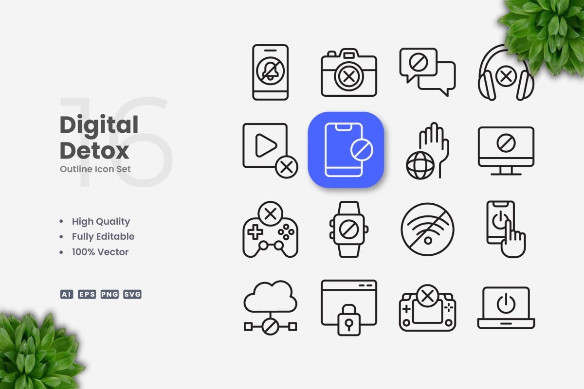 Set of 16 Digital Detox outline icons | Simple and clean design, perfect for websites, mobile apps, books, social media, infographics, flyer, print, banners, posters and many more. To resize, change color, or edit stroke weight, you can easily edit on vector software like Adobe Illustrator and CorelDRAW.