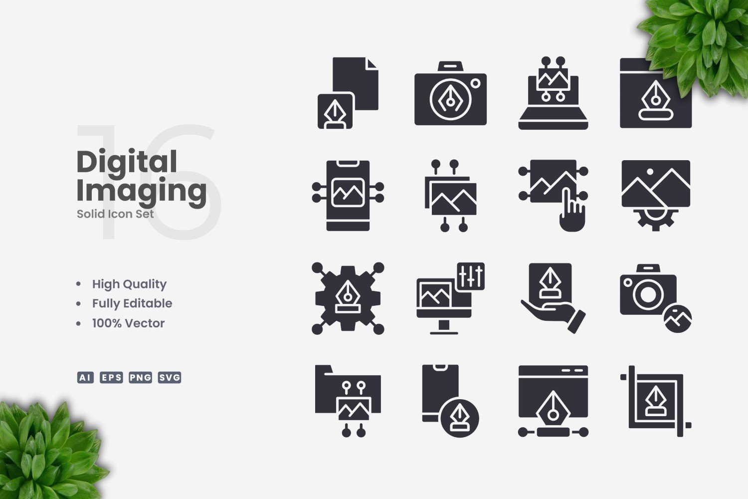Set of 16 Digital Imaging Solid Icons | Simple and clean design, perfect for websites, mobile apps, books, social media, infographics, flyer, print, banners, posters and many more. To resize or change color you can easily edit on vector software like Adobe Illustrator and CorelDRAW.