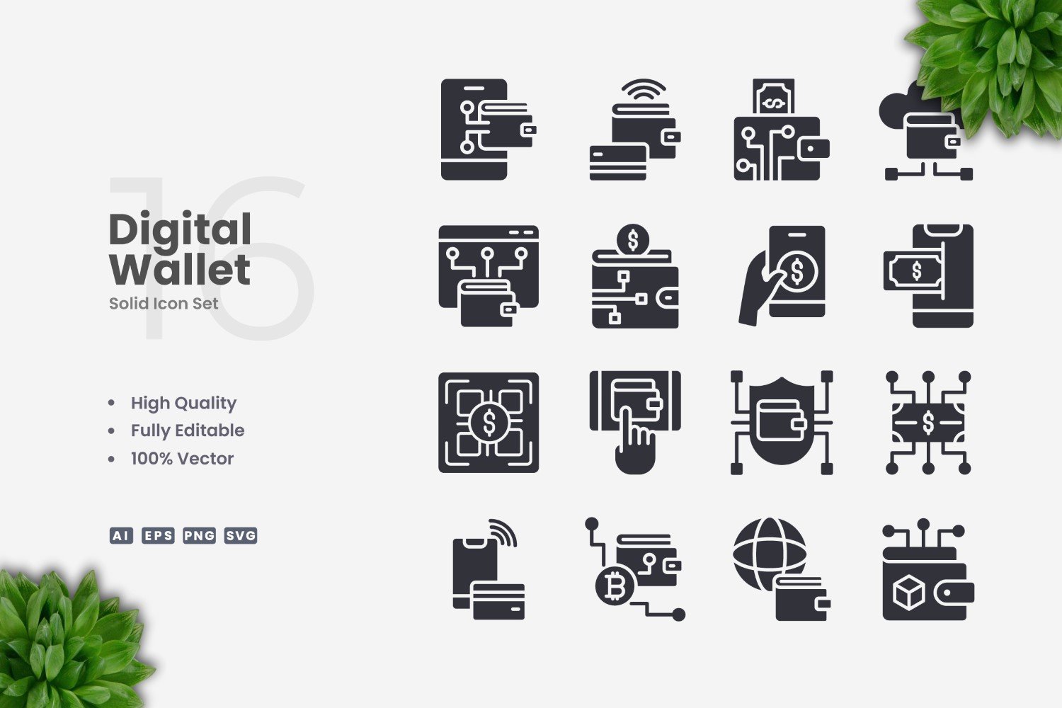 Set of 16 Digital Wallet Solid Icons | Simple and clean design, perfect for websites, mobile apps, books, social media, infographics, flyer, print, banners, posters and many more. To resize or change color you can easily edit on vector software like Adobe Illustrator and CorelDRAW.