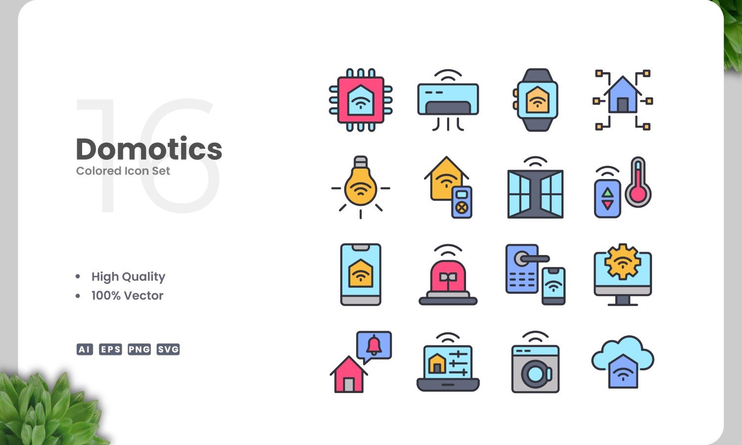 Set of 16 Domotics colored icons | Simple and clean design, perfect for websites, mobile apps, books, social media, infographics, flyer, print, banners, posters and many more. To resize or change color you can easily edit on vector software like Adobe Illustrator and CorelDRAW.