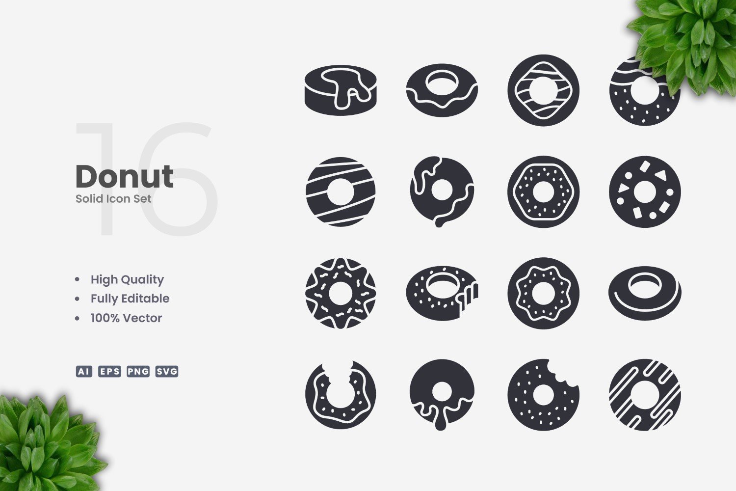 Set of 16 Donut Solid Icons | Simple and clean design, perfect for websites, mobile apps, books, social media, infographics, flyer, print, banners, posters and many more. To resize or change color you can easily edit on vector software like Adobe Illustrator and CorelDRAW.