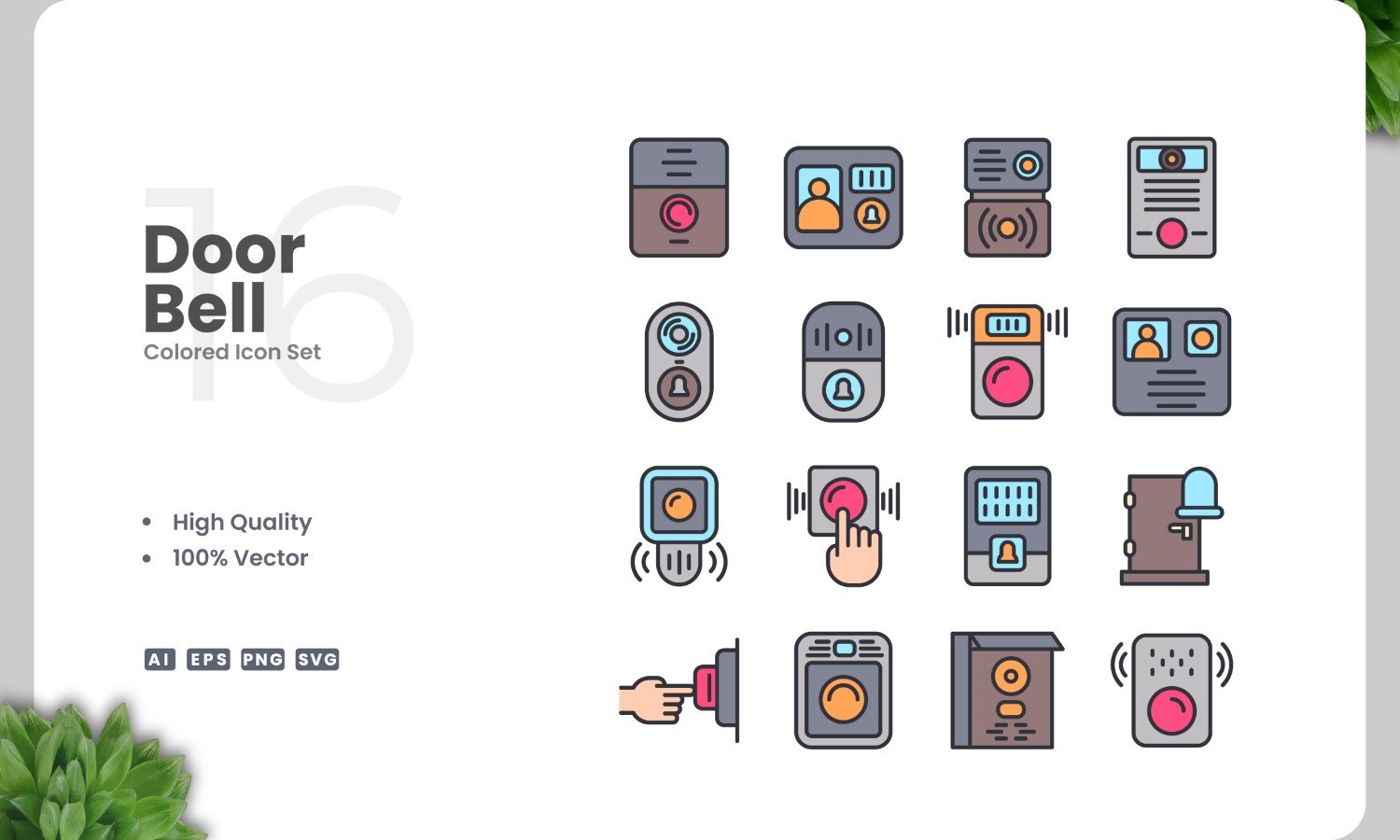 Set of 16 Door Bell colored icons | Simple and clean design, perfect for websites, mobile apps, books, social media, infographics, flyer, print, banners, posters and many more. To resize or change color you can easily edit on vector software like Adobe Illustrator and CorelDRAW.