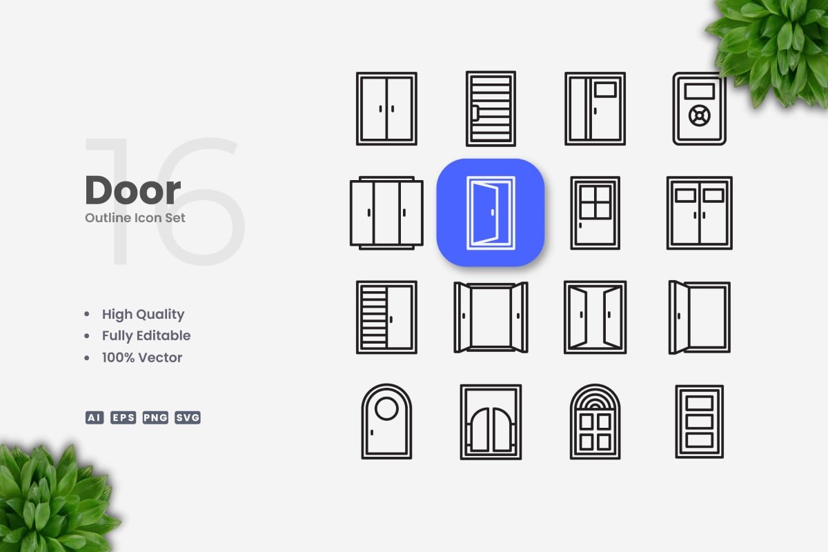 Set of 16 Door outline icons | Simple and clean design, perfect for websites, mobile apps, books, social media, infographics, flyer, print, banners, posters and many more. To resize, change color, or edit stroke weight, you can easily edit on vector software like Adobe Illustrator and CorelDRAW.