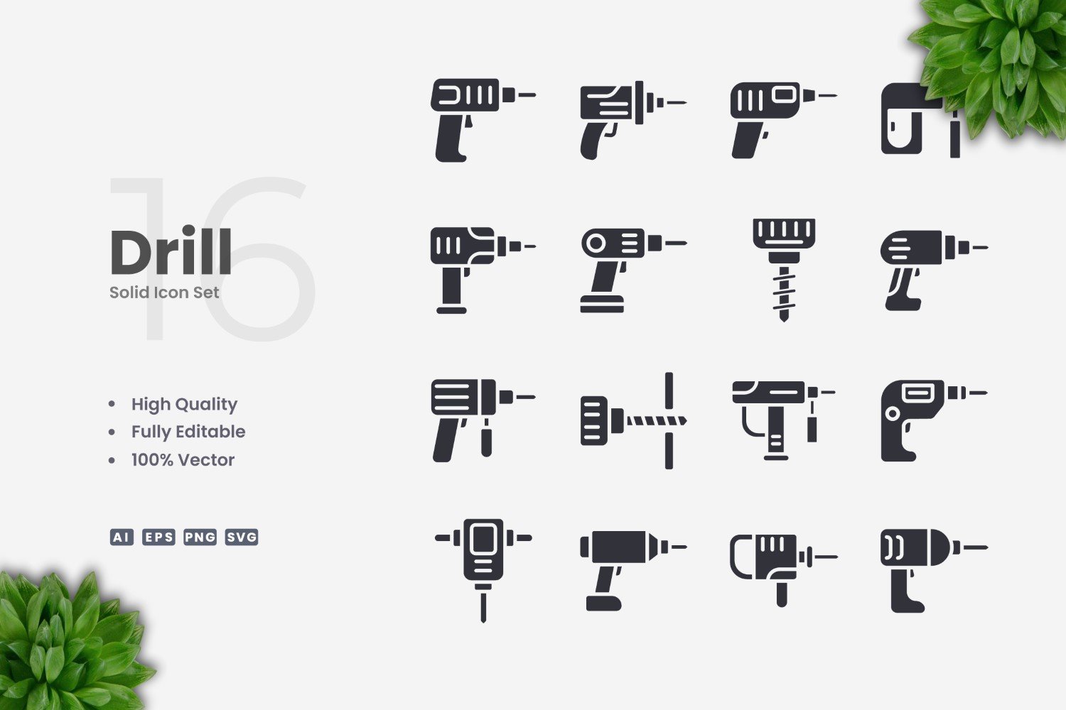 Set of 16 Drill Solid Icons | Simple and clean design, perfect for websites, mobile apps, books, social media, infographics, flyer, print, banners, posters and many more. To resize or change color you can easily edit on vector software like Adobe Illustrator and CorelDRAW.
