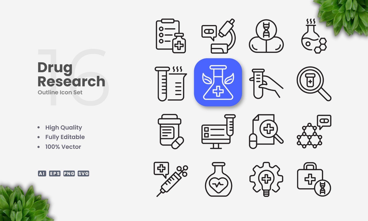 Set of 16 Drug Research outline icons | Simple and clean design, perfect for websites, mobile apps, books, social media, infographics, flyer, print, banners, posters and many more. To resize, change color, or edit stroke weight, you can easily edit on vector software like Adobe Illustrator and CorelDRAW.