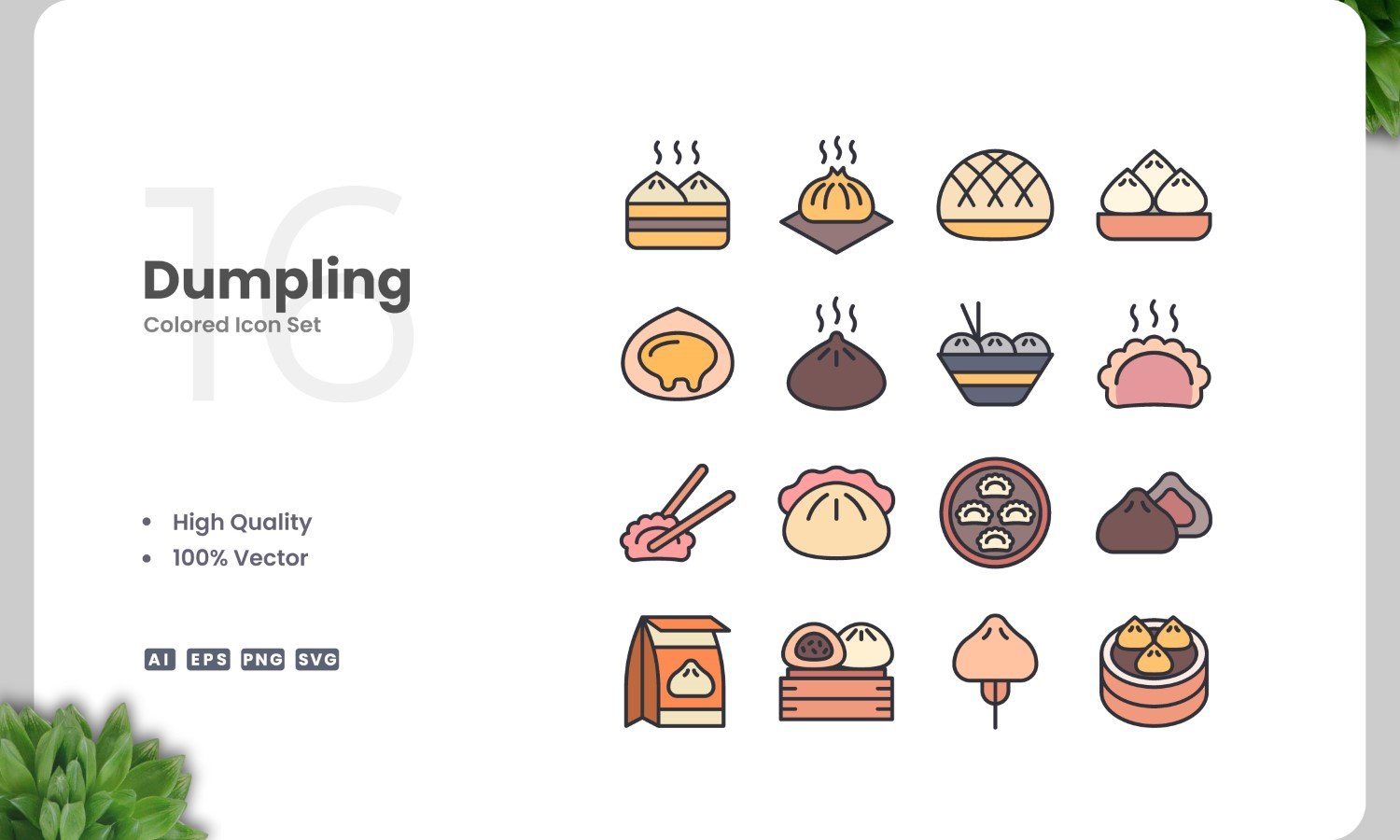 Set of 16 Dumpling colored icons | Simple and clean design, perfect for websites, mobile apps, books, social media, infographics, flyer, print, banners, posters and many more. To resize or change color you can easily edit on vector software like Adobe Illustrator and CorelDRAW.