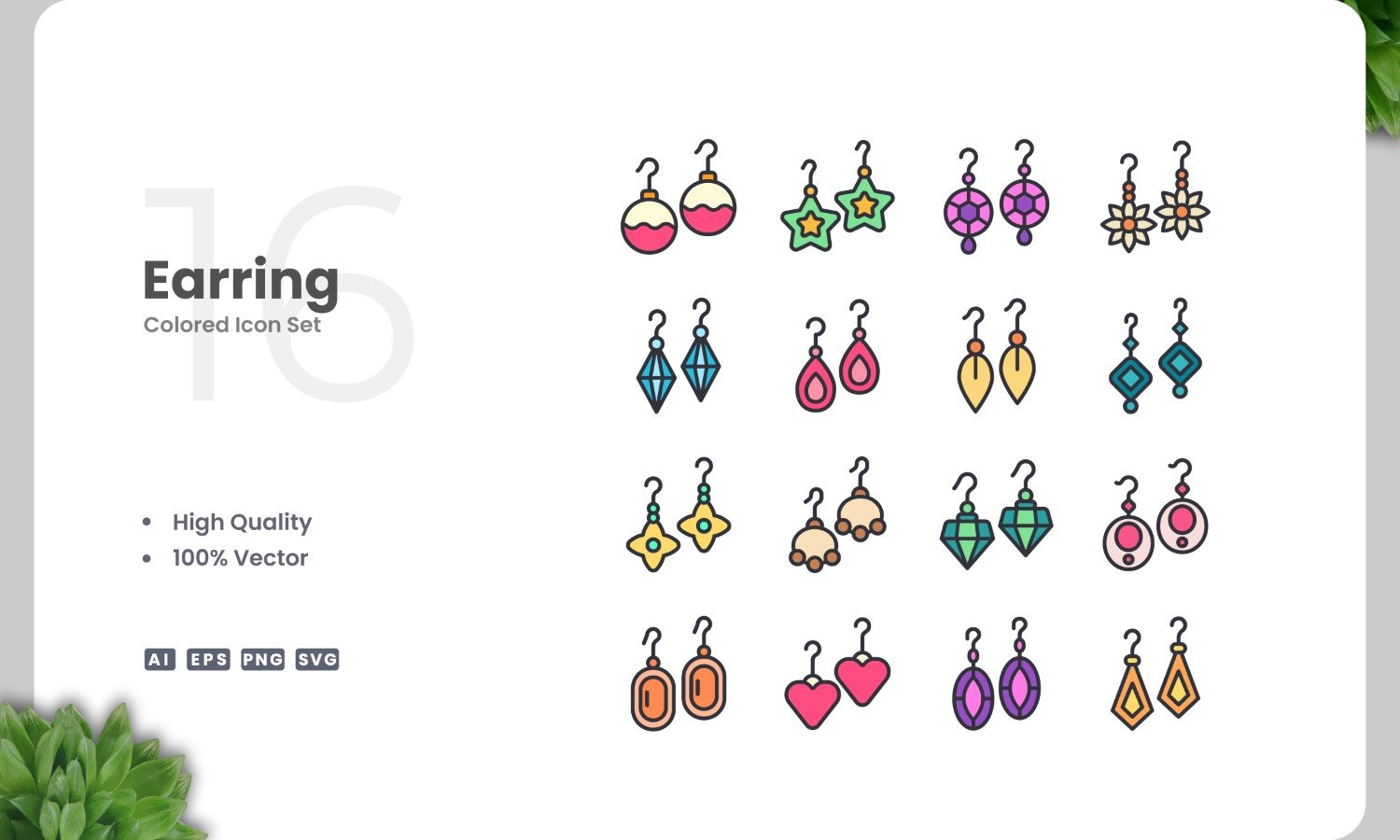 Set of 16 Earring colored icons | Simple and clean design, perfect for websites, mobile apps, books, social media, infographics, flyer, print, banners, posters and many more. To resize or change color you can easily edit on vector software like Adobe Illustrator and CorelDRAW.
