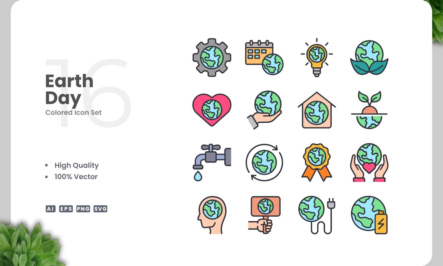 Set of 16 Earth Day colored icons | Simple and clean design, perfect for websites, mobile apps, books, social media, infographics, flyer, print, banners, posters and many more. To resize or change color you can easily edit on vector software like Adobe Illustrator and CorelDRAW.