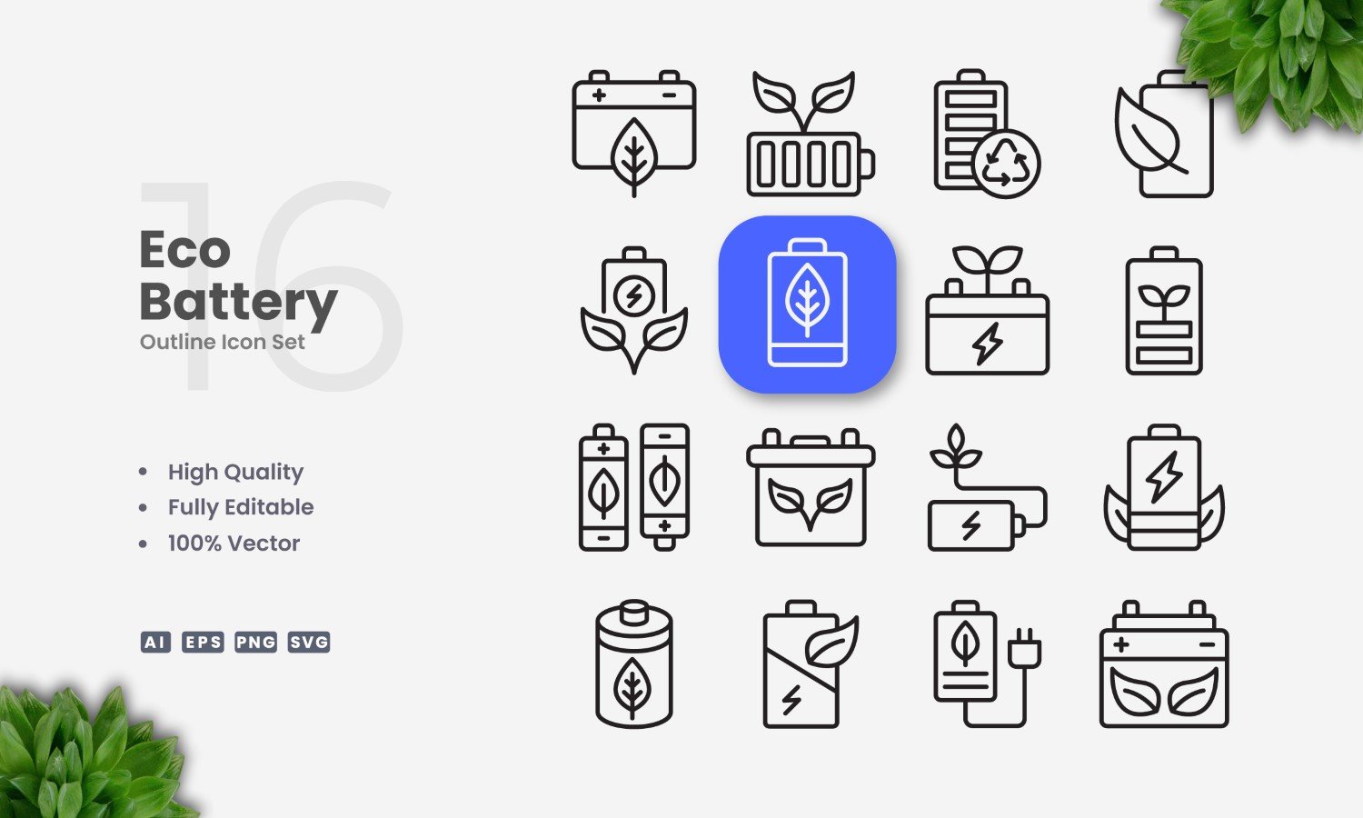 Set of 16 Eco Battery outline icons | Simple and clean design, perfect for websites, mobile apps, books, social media, infographics, flyer, print, banners, posters and many more. To resize, change color, or edit stroke weight, you can easily edit on vector software like Adobe Illustrator and CorelDRAW.