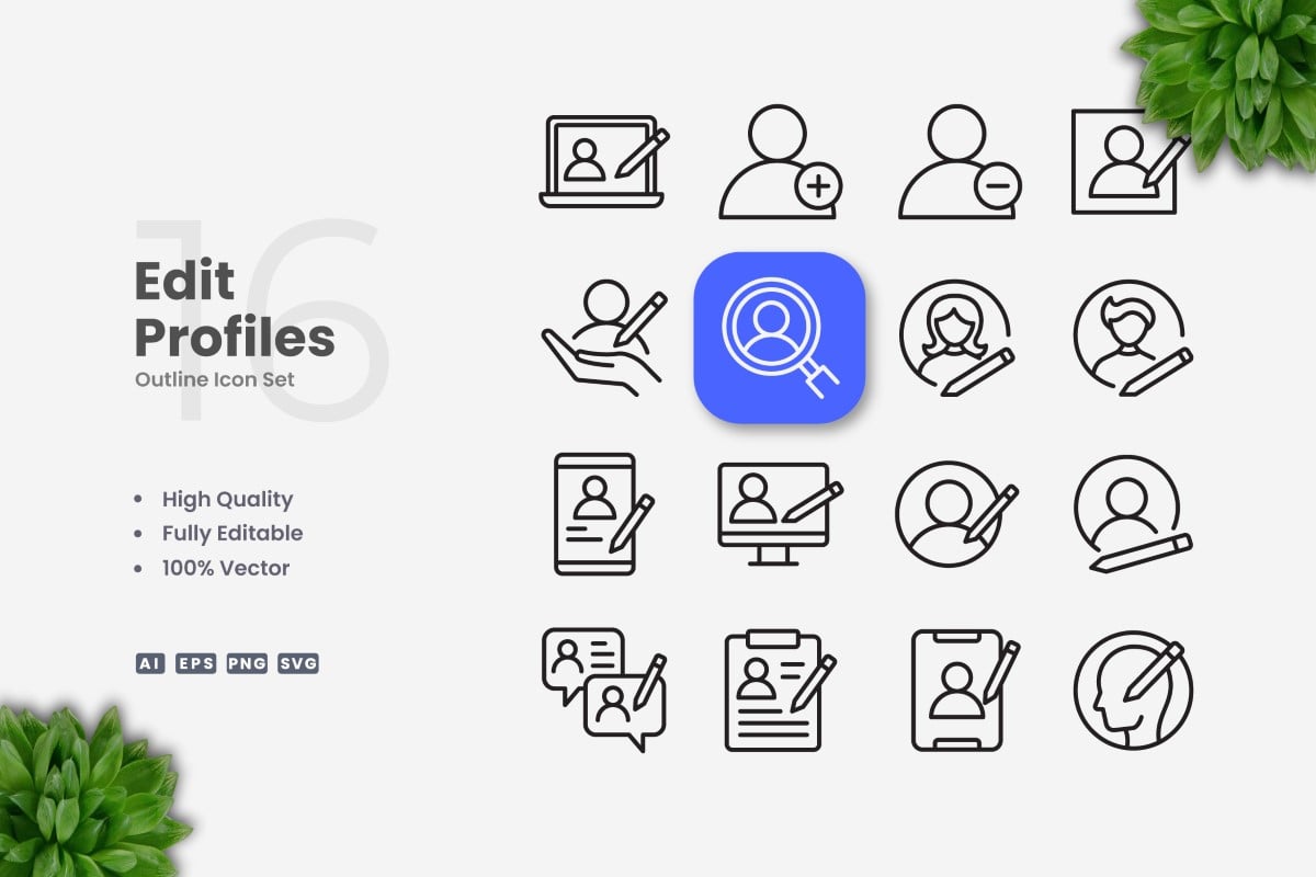 Set of 16 Edit Profile outline icons | Simple and clean design, perfect for websites, mobile apps, books, social media, infographics, flyer, print, banners, posters and many more. To resize, change color, or edit stroke weight, you can easily edit on vector software like Adobe Illustrator and CorelDRAW.