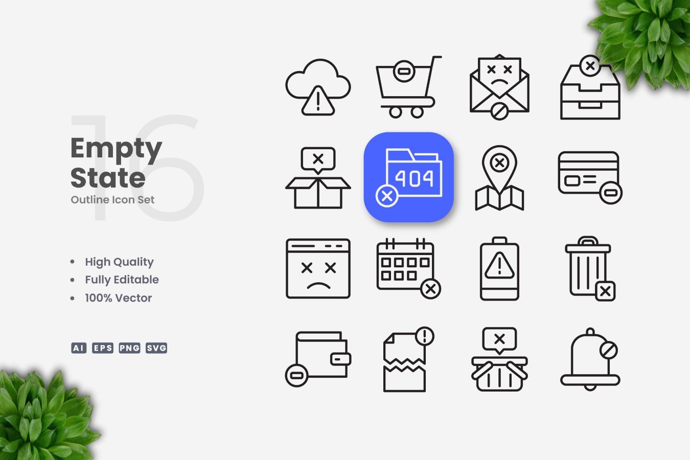 Set of 16 Empty State outline icons | Simple and clean design, perfect for websites, mobile apps, books, social media, infographics, flyer, print, banners, posters and many more. To resize, change color, or edit stroke weight, you can easily edit on vector software like Adobe Illustrator and CorelDRAW.
