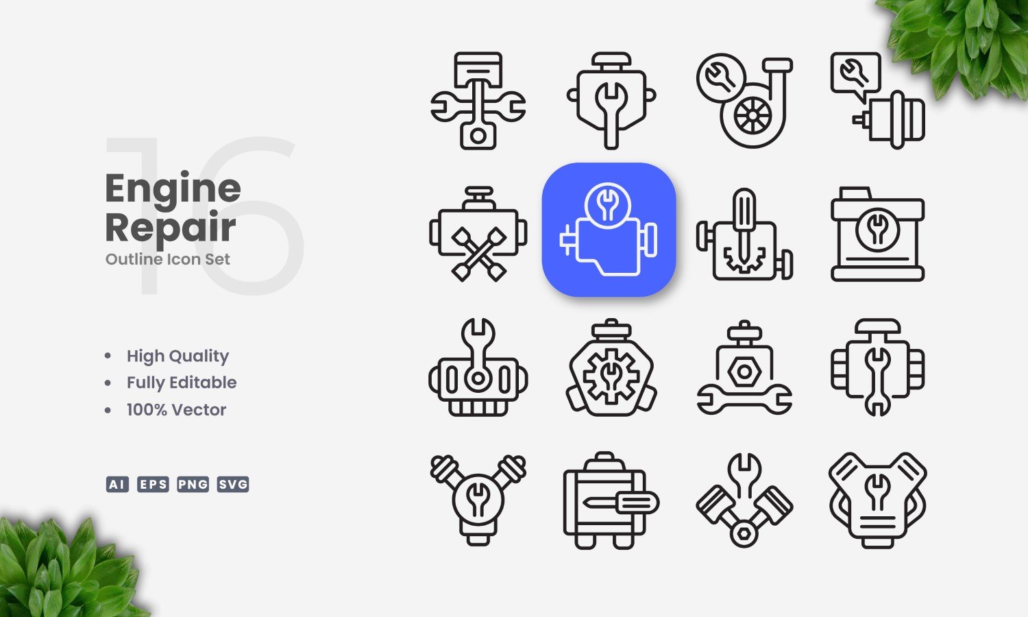 Set of 16 Engine Repair outline icons | Simple and clean design, perfect for websites, mobile apps, books, social media, infographics, flyer, print, banners, posters and many more. To resize, change color, or edit stroke weight, you can easily edit on vector software like Adobe Illustrator and CorelDRAW.
