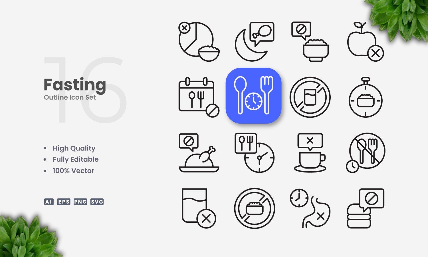 Set of 16 Fasting outline icons | Simple and clean design, perfect for websites, mobile apps, books, social media, infographics, flyer, print, banners, posters and many more. To resize, change color, or edit stroke weight, you can easily edit on vector software like Adobe Illustrator and CorelDRAW.