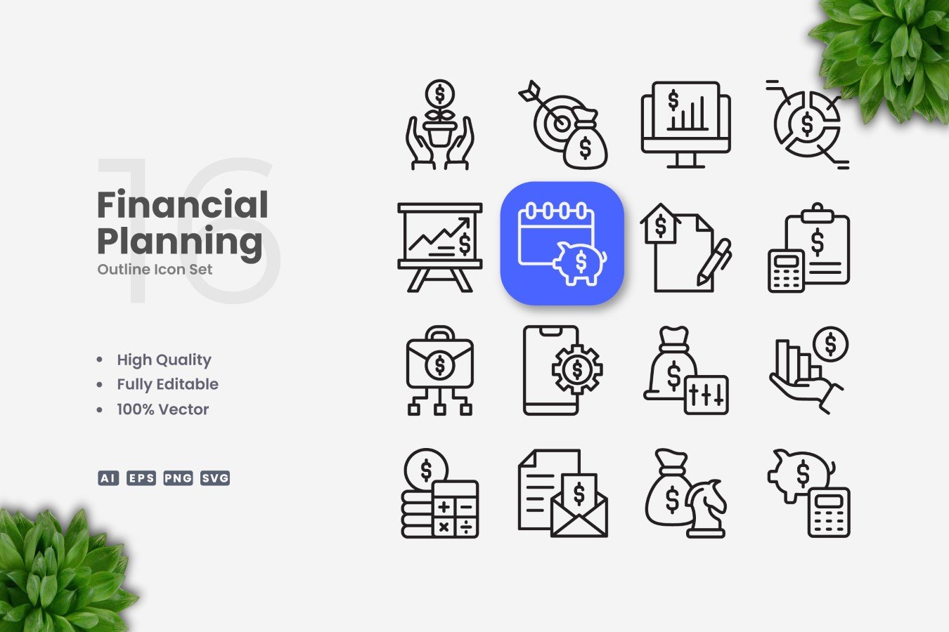 Set of 16 Financial Planning outline icons | Simple and clean design, perfect for websites, mobile apps, books, social media, infographics, flyer, print, banners, posters and many more. To resize, change color, or edit stroke weight, you can easily edit on vector software like Adobe Illustrator and CorelDRAW.