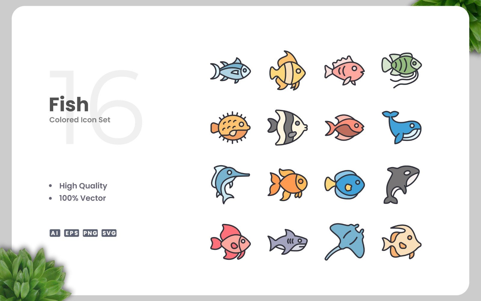Set of 16 Fish colored icons | Simple and clean design, perfect for websites, mobile apps, books, social media, infographics, flyer, print, banners, posters and many more. To resize or change color you can easily edit on vector software like Adobe Illustrator and CorelDRAW.