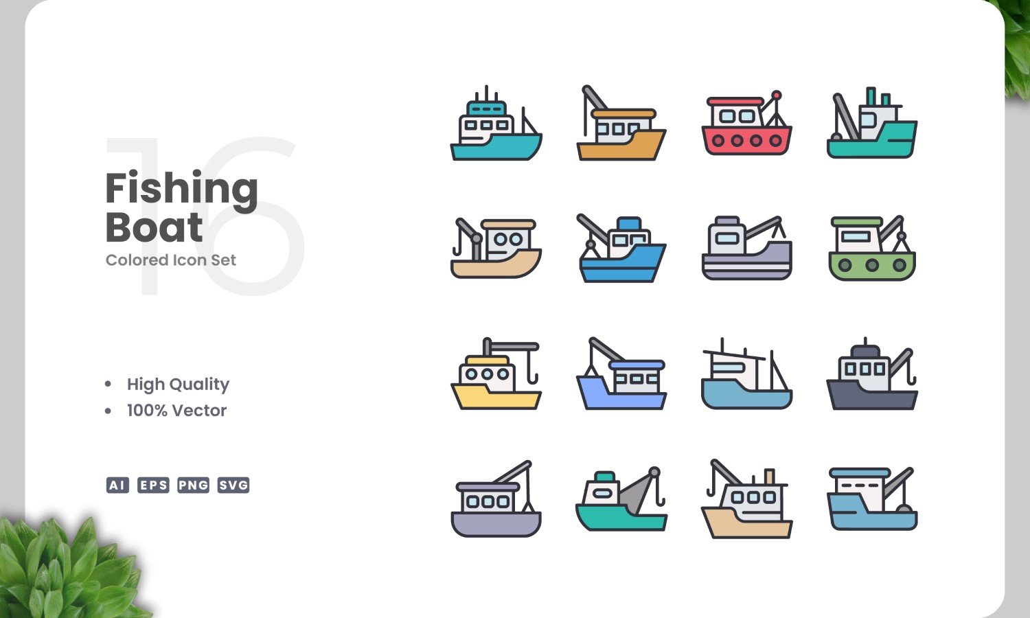 Set of 16 Fishing Boat color icons | Simple and clean design, perfect for websites, mobile apps, books, social media, infographics, flyer, print, banners, posters and many more. To resize or change color you can easily edit on vector software like Adobe Illustrator and CorelDRAW.