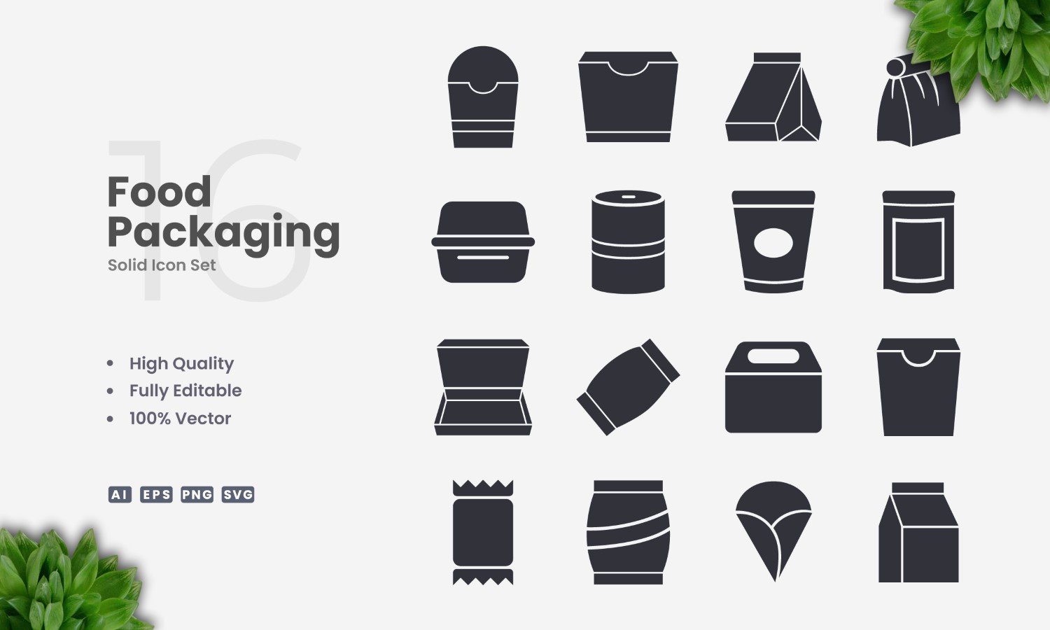 Set of 16 Food Packaging solid icons | Simple and clean design, perfect for websites, mobile apps, books, social media, infographics, flyer, print, banners, posters and many more. To resize or change color you can easily edit on vector software like Adobe Illustrator and CorelDRAW.