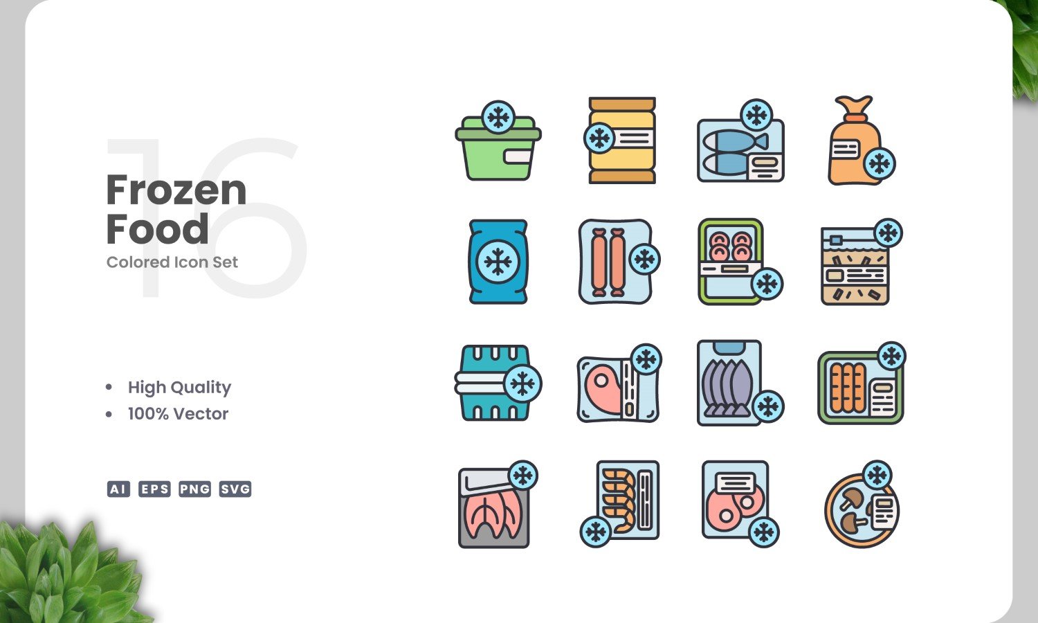 Set of 16 Frozen Food color icons | Simple and clean design, perfect for websites, mobile apps, books, social media, infographics, flyer, print, banners, posters and many more. To resize or change color you can easily edit on vector software like Adobe Illustrator and CorelDRAW.