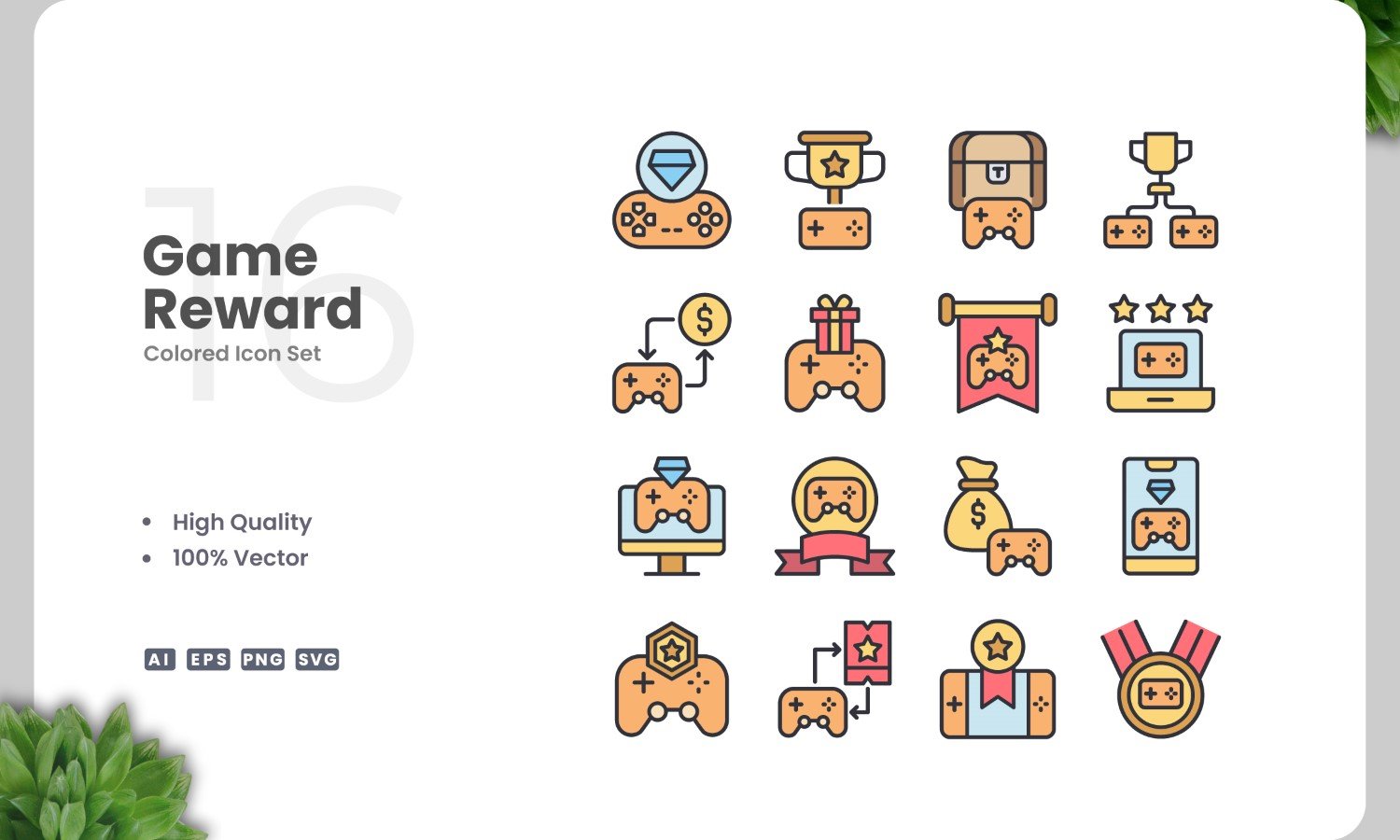 Set of 16 Game Reward colored icons | Simple and clean design, perfect for websites, mobile apps, books, social media, infographics, flyer, print, banners, posters and many more. To resize or change color you can easily edit on vector software like Adobe Illustrator and CorelDRAW.