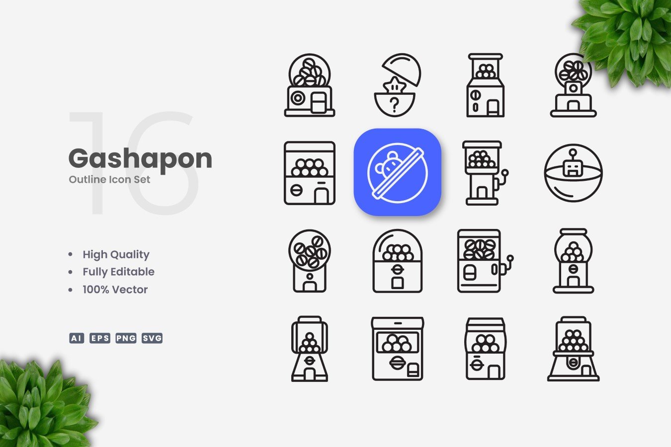 Set of 16 Gashapon outline icons | Simple and clean design, perfect for websites, mobile apps, books, social media, infographics, flyer, print, banners, posters and many more. To resize, change color, or edit stroke weight, you can easily edit on vector software like Adobe Illustrator and CorelDRAW.
