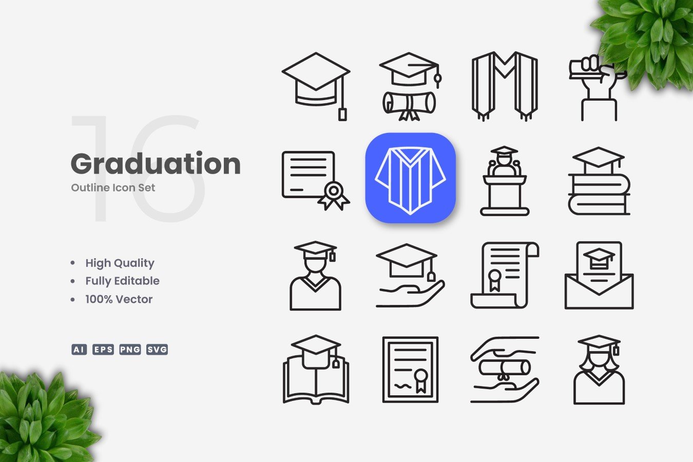 Set of 16 Graduation outline icons | Simple and clean design, perfect for websites, mobile apps, books, social media, infographics, flyer, print, banners, posters and many more. To resize, change color, or edit stroke weight, you can easily edit on vector software like Adobe Illustrator and CorelDRAW.